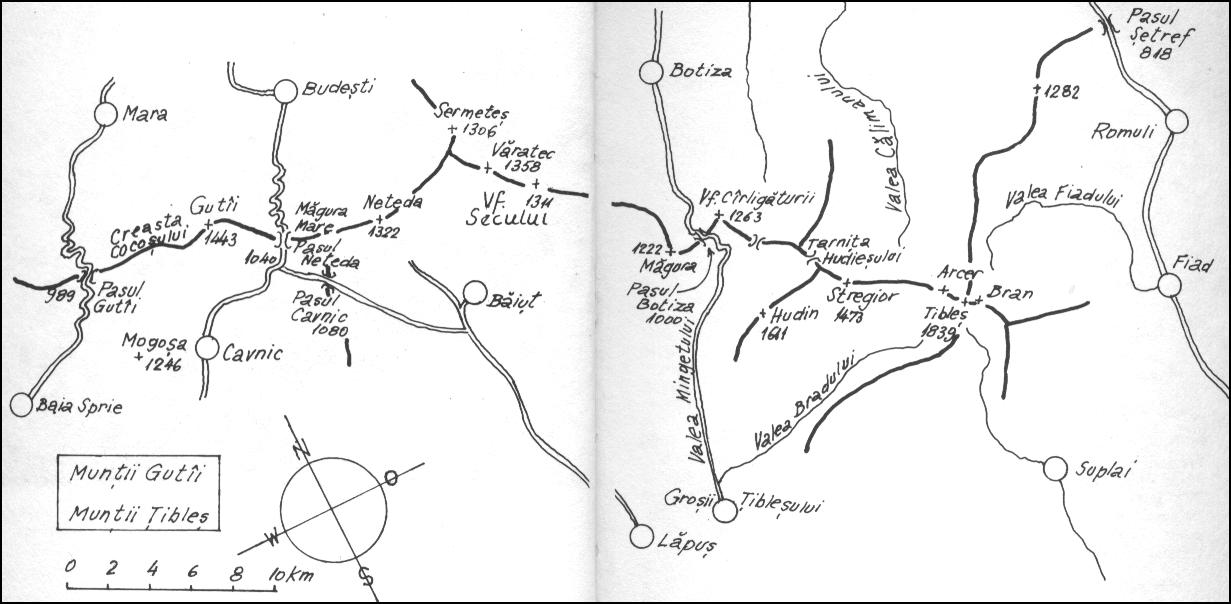 Vom "Hahnenkamm" gesehen, beschreibt das Gutîi-Gebirge ein S. Erst geht es in südöstlicher, dann in nordöstlicher Richtung bis zum Gutîiul Mare, 1443 m, dann wieder südöstlich zum Gutîiul Mic und Vîrful Dealului, 1111 m. Der Kamm ist von knietiefem Krummholz bewachsen. Ab Vîrful Dealului geht es hinunter in den Wald, wo der Pfad verschwindet. So gut es geht, halten wir die östliche Richtung ein. Zuletzt erreichen wir eine Forststrasse, die nach einem Kilometer in die Passstrasse Budesti-Cavnic mündet. Auf dieser wandern wir nun 3 km in südlicher Richtung bis zur Passhöhe (Neteda-Pass, 1040 m). Während die Strasse weiter nach Cavnic (1 km) führt, wenden wir uns ostwärts, dem Mágura-Mare-Berg zu.