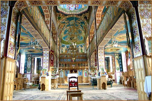 Innenansichten | Die neue Kirche im Innern ... ... nahe der Biserica de Lemn Bâlenilor. Die äussere Schlichtheit des Kirchenneubaus trügt, denn im Innern des Gebäudes erwartet den Besucher eine üppige Bemalung. |